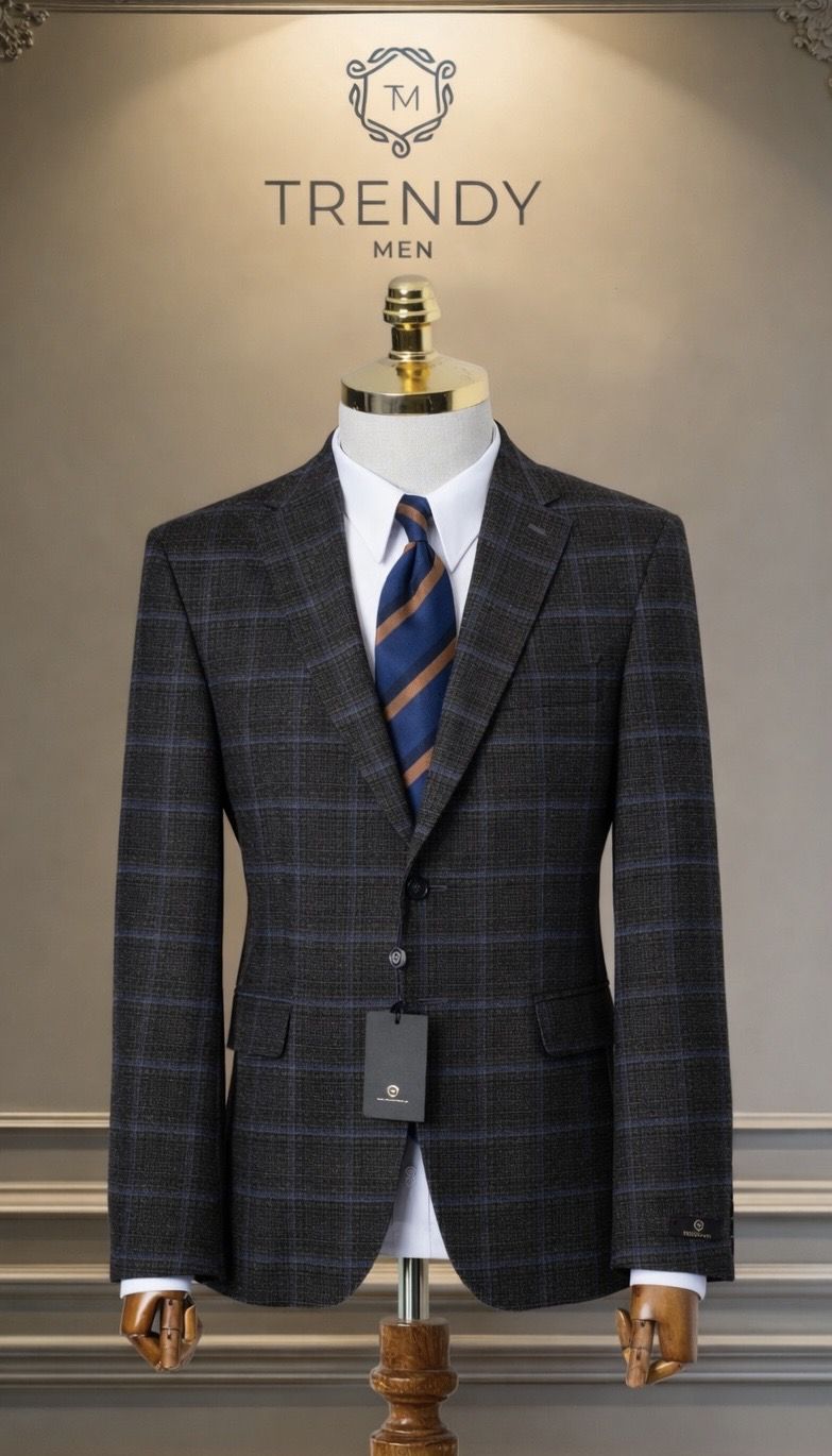 Marynarka męska - grafitowy melanż w niebieską kratę